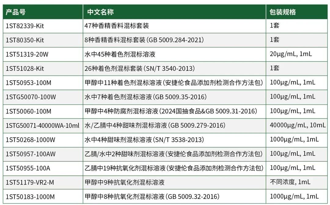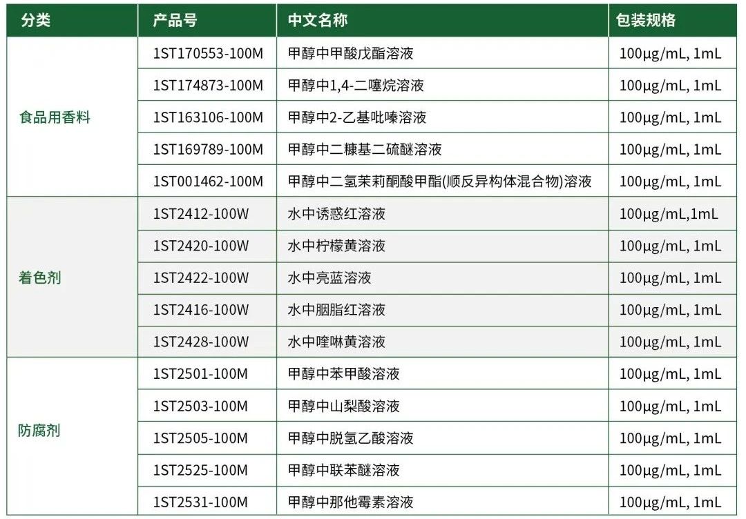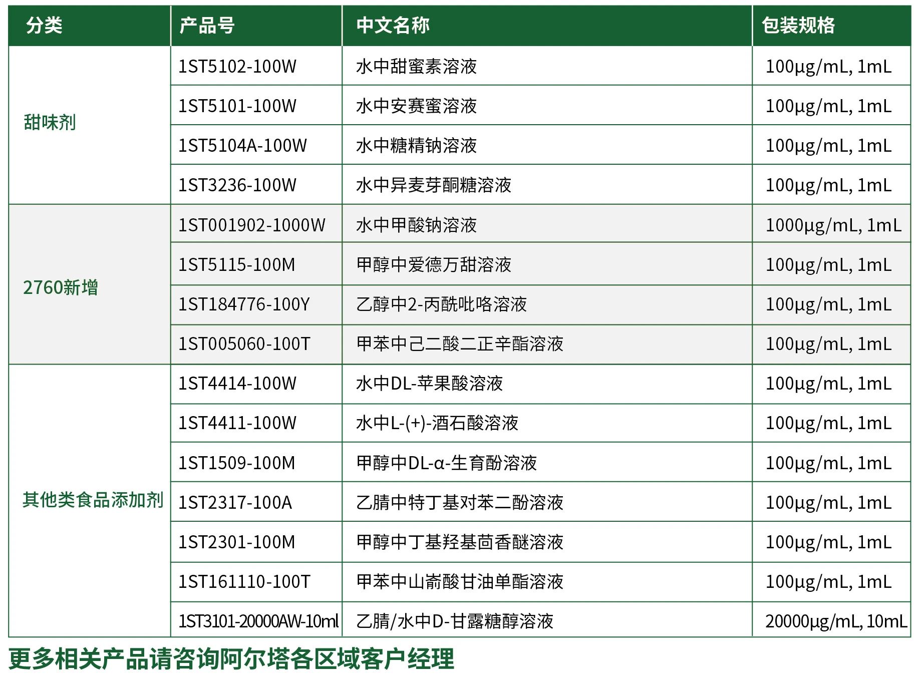 阿爾塔科技作為CNAS認(rèn)可的國產(chǎn)標(biāo)準(zhǔn)物質(zhì)生產(chǎn)者,結(jié)合國家及行業(yè)相關(guān)檢測標(biāo)準(zhǔn),推出食品添加劑檢測標(biāo)準(zhǔn)物質(zhì)解決方案,為保障食品安全提供技術(shù)支撐,推動食品工業(yè)的持續(xù)發(fā)展。