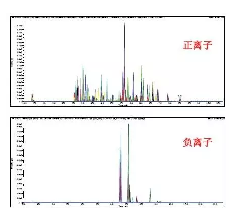質(zhì)譜采用電噴霧(ESI)正負(fù)離子化、MRM采集方式 ,同一液相色譜方法,LC-MS/MS分析時間為13.5 min。