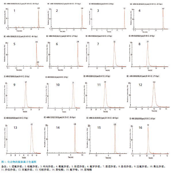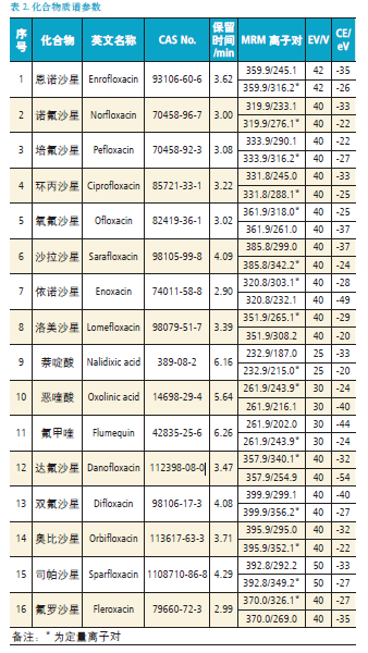 以下參數(shù)以PerkinElmerQSight 200 系列為例,喹諾酮類(lèi)化合物質(zhì)譜參數(shù)見(jiàn)表2。