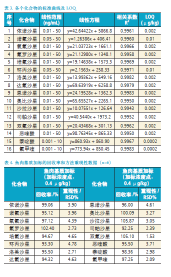 其余喹諾酮目標(biāo)化合物的標(biāo)準(zhǔn)曲線在0.01-50 ng/mL,依次為0.01,0.02,0.05,0.1,0.2,0.5,1.0,2.0,5.0,10.0,20.0,50.0 ng/mL。其中,諾氟沙星和環(huán)丙沙星為0.05-50 ng/mL,萘啶酸和氟甲喹為0.001-10 ng/mL。標(biāo)準(zhǔn)曲線范圍內(nèi)具有良好的線性(R2> 0.994);采用魚(yú)肉基質(zhì)作為加標(biāo)樣品,平行6 個(gè)樣品測(cè)試方法的回收率和方法重現(xiàn)性,詳細(xì)結(jié)果請(qǐng)見(jiàn)表4。從表4 可以看到,在加標(biāo)濃度為2 ng/mL 下,回收率為92.25-105.87 %,方法重現(xiàn)性為1.53-4.78%。最低定量限為0.0002-0.01μg/kg,完全符合殘留檢測(cè)要求。