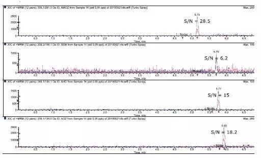 上述方法可完全適用于農(nóng)業(yè)部783號公告-1-2006《水產(chǎn)品中硝基呋喃類代謝產(chǎn)物殘留量的測定液相色譜-串聯(lián)質(zhì)譜法》,該法適合Sciex公司Triple Quad? 3200系列、3500系列、4000系列、4500系列、API 5000、5500系列以及6500系列的LC-MS/MS系統(tǒng)。靈敏度高,重現(xiàn)性好,適用于各相關實驗室進行該類物質(zhì)的日常分析。