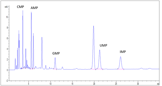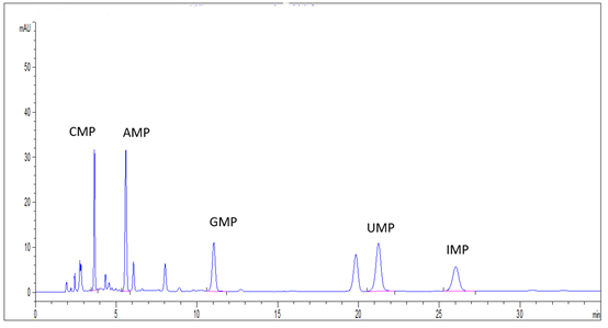 5種核苷酸混合標(biāo)準(zhǔn)溶液:分別稱(chēng)取核苷酸標(biāo)準(zhǔn)品CMP、AMP、UMP各10mg、GMP、IMP各5mg(精確至0.1mg),用水溶解成并定容至100mL,混勻,即得;