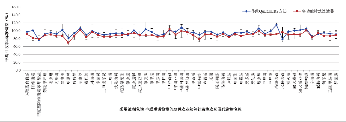 QuSEL 多功能針式過濾器是由中國農業(yè)科學院農業(yè)質量標準與檢測技術研究所研制,用于樣品快速凈化處理的專利產品,該過濾器將QuEChERS方法中傳統(tǒng)的凈化步驟(吸附劑稱量、提取液移取、渦旋吸附凈化、微孔濾膜過濾等)整合簡化為一步操作,將提取液經(jīng)過濾器直接過濾至進樣瓶中即可上機檢測,實現(xiàn)同時凈化吸附和微孔濾膜過濾等多種作用功能。使用多功能針式過濾器,可極為顯著地減少樣品凈化處理步驟,使操作更為簡單,大幅提高工作效率,并且經(jīng)實驗測試評價,目標物添加回收率等方法性能參數(shù)與傳統(tǒng)QuEChERS方法無明顯差異,說明具有良好的凈化過濾效果。將該款多功能針式過濾器與E0331輔助過濾器設備配套使用,可同時對24個樣品進行處理,進一步提高樣品前處理效率。
