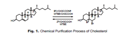 Chemical purification is a powerful method for many compounds that can’t be separated by normal purification techniques. The principal of chemical purification is to transform one of the compositions in the mixture to another more structural different compound through chemical reaction, then to achieve the separation of the two moieties. Cholesterol on the market is usually contains impurities, such as cholestan-3-ol, cholest-7-en-3-ol, and cholesta-5,7-dien-3-oI. These impurities can’t be removed by recrystallization.Bases on the different reactivity towards bromine, addition reactions of the C=C double bond in cholesterol (3β-cholest-5-en-3-ol) and impurities of 3β-cholest-7-en-3-ol and 3β-cholesta-5,7-dien-3-oI with bromine form brominated compounds(Fig. 1). Among them, the 5,6-dibromocholesterol is precipitated from the tert-butyl methyl ether solution, yet the brominated impurities, the oxidation products, 7-ketocholesterol and cholestane-3,25-diol, and other unreacted impurities remain in the solution because of the solubility differences. Filtration under vacuum achieves the separation of the product precipitated and impurities in the solution. In the subsequent reaction , the dibrimocholesterol was treated with zinc dust in acetic acid to regenerate the cholesterol by reductive debromination. Removal of inorganicsolid by filtration, the cholesterol solution was partially evaporated to afford cholesterol as white crystalline. To optimizethe reaction conditions, different solvents and reactant ratio are investigated. The best result is achieved in the first step of reactionat ratio of cholesterol : bromine = 1 : 1.1. tert-Butyl methylether is a better solvent than diethyl ether in large scale process.The second reaction is optimized at ratio of dibromochlesterol :zinc = 1 : 1.5, and using methanol as crystallization solvent. The process gives 80% yield in kilogram scale.