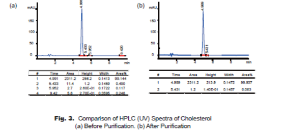 Because of the weak UV absorption property of cholesterol structure, the HPLC spectra are taken at 220nm, which looks like the better wavelength to reflect the purity of the product. HPLC spectra demonstrate that the major impurity at 5.43min (cholest-7-en-3-ol) is reduced from 0.49% to 0.06%, and the impurity at 5.95min is not observed after purification (Fig. 3-a, Fig. 3-b), the purity of cholesterol product is improved significantly to 99.9%.